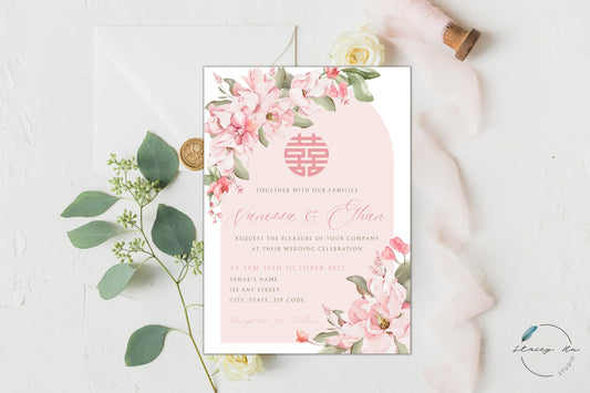 Blush Magnolia and Orchid Wedding Invitation Set | Traditional Chinese & English | 5x7