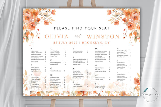Boho Orange Floral Seating Chart | Alphabetical | Landscape | 18x24