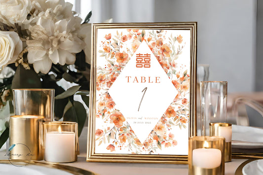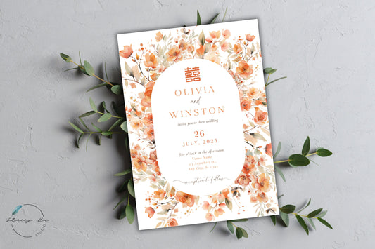 Boho Orange Floral Wedding Invitation Set | Traditional Chinese & English | 5x7 IN