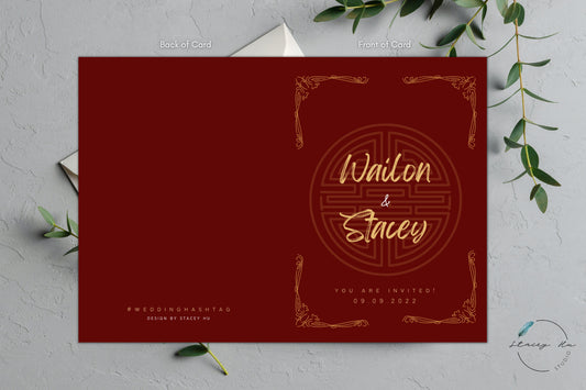 Burgundy and Gold Asian Wedding Folded Invitation Card | Modern Chinese & English | 5x7 IN