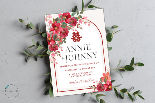 Cream and Red Floral Wedding Invitation Set | Traditional Chinese & English | 5x7 IN