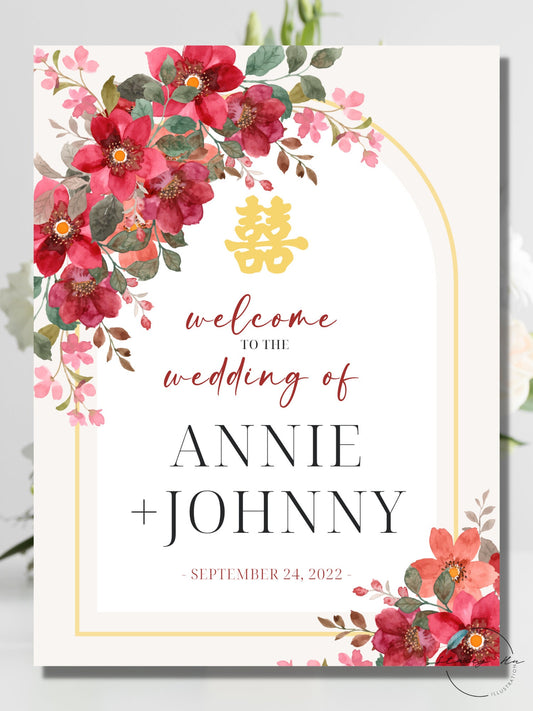 Cream and Red Floral Wedding Welcome Sign | Portrait | 18x24 IN