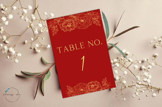 Red & Gold Lined Floral Table Number | 5x7 IN | 2 Colors